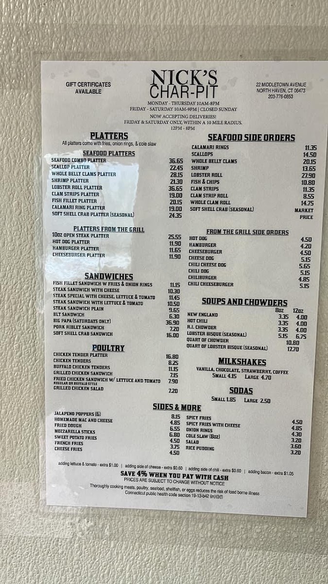 Welcome to Nick's Char Pit, where great food meets a warm atmosphere, located conveniently at 22 Middletown Ave, North Haven, CT. This eatery offers a captivating menu that is already winning hearts. One standout dish is the Big Papa Burger, praised for its unique fried dough bun reminiscent of donuts, paired with crispy bacon and a spicy chipotle kick. Other patrons rave about the seafood platter, featuring a delightful combination of fish, clams, shrimp, and calamari—enough to satisfy even the hungriest diners.